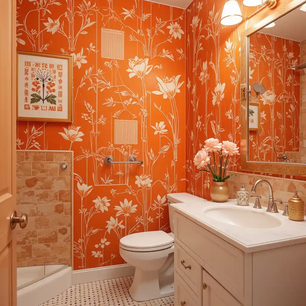 Go bold with vintage-style orange wallpaper featuring retro shapes or floral patterns. It works great in powder rooms for a fun surprise.