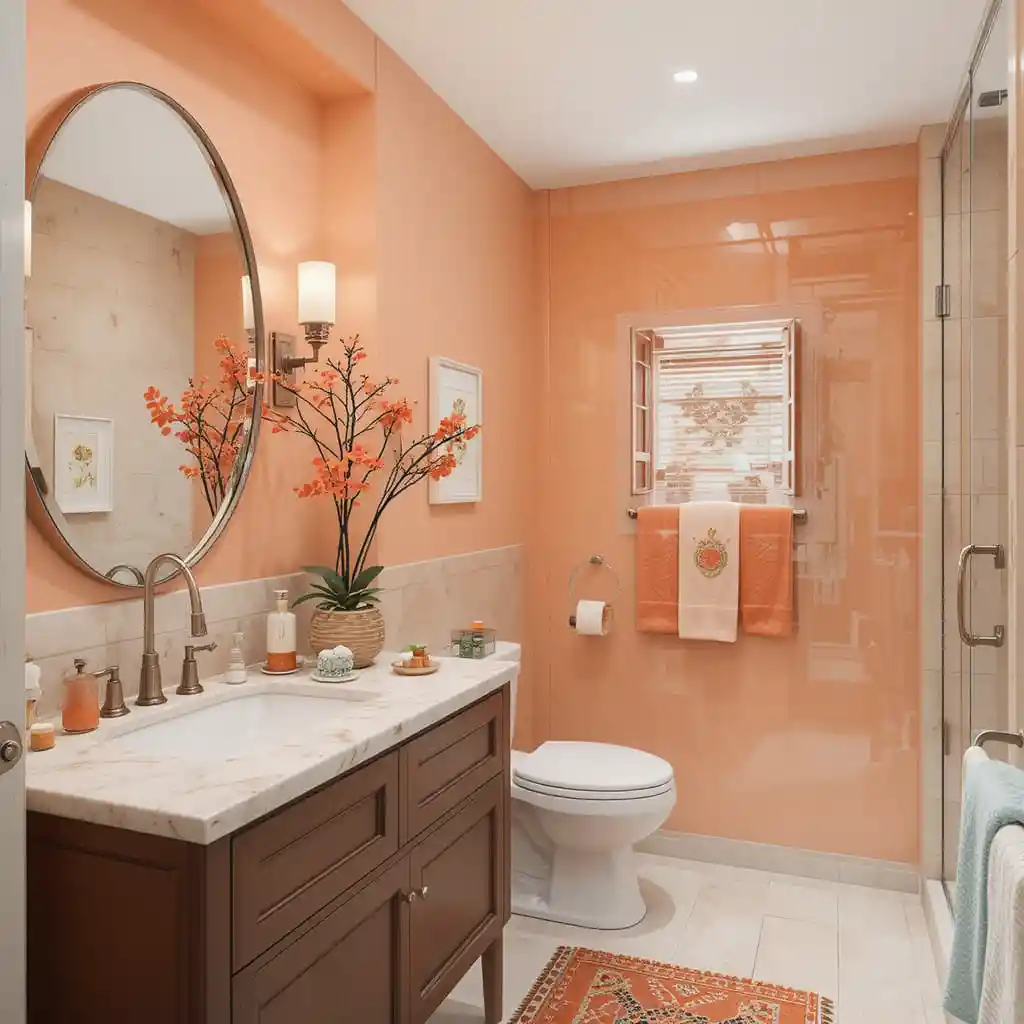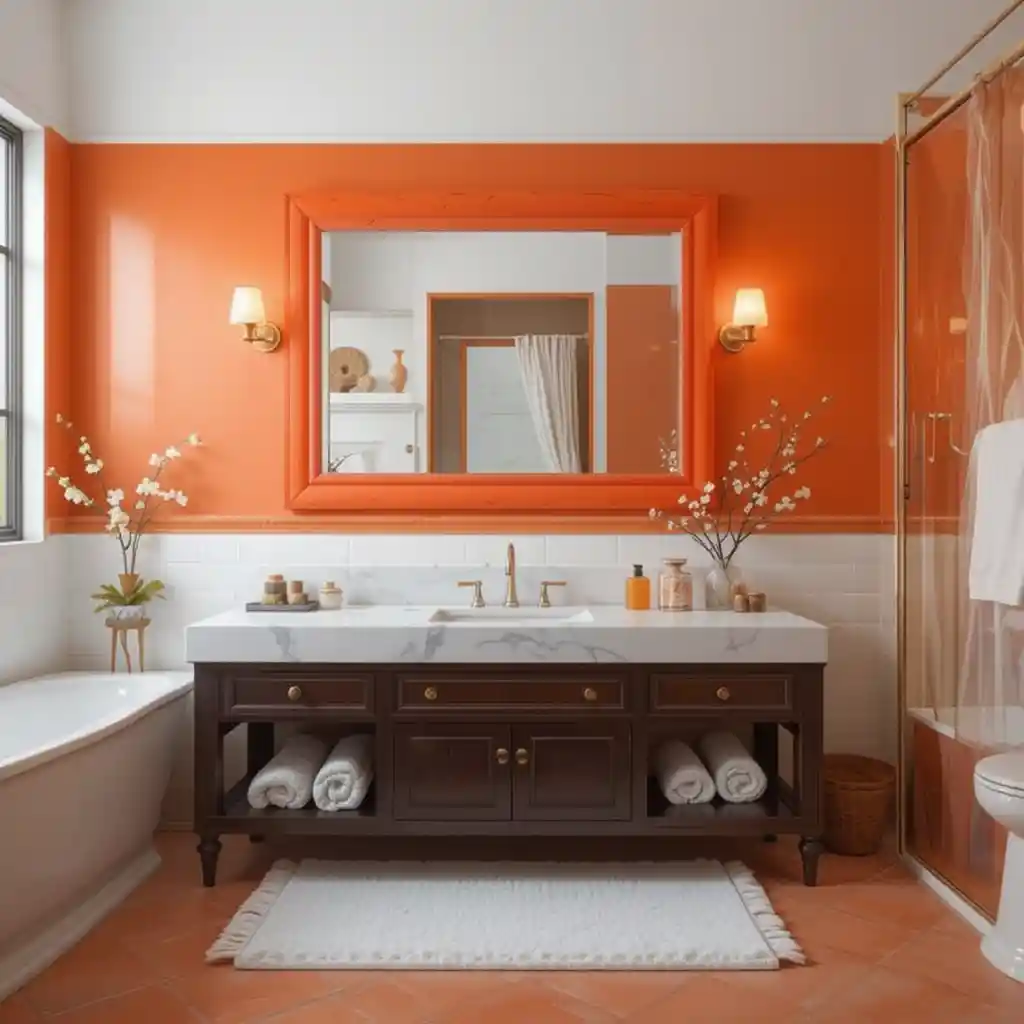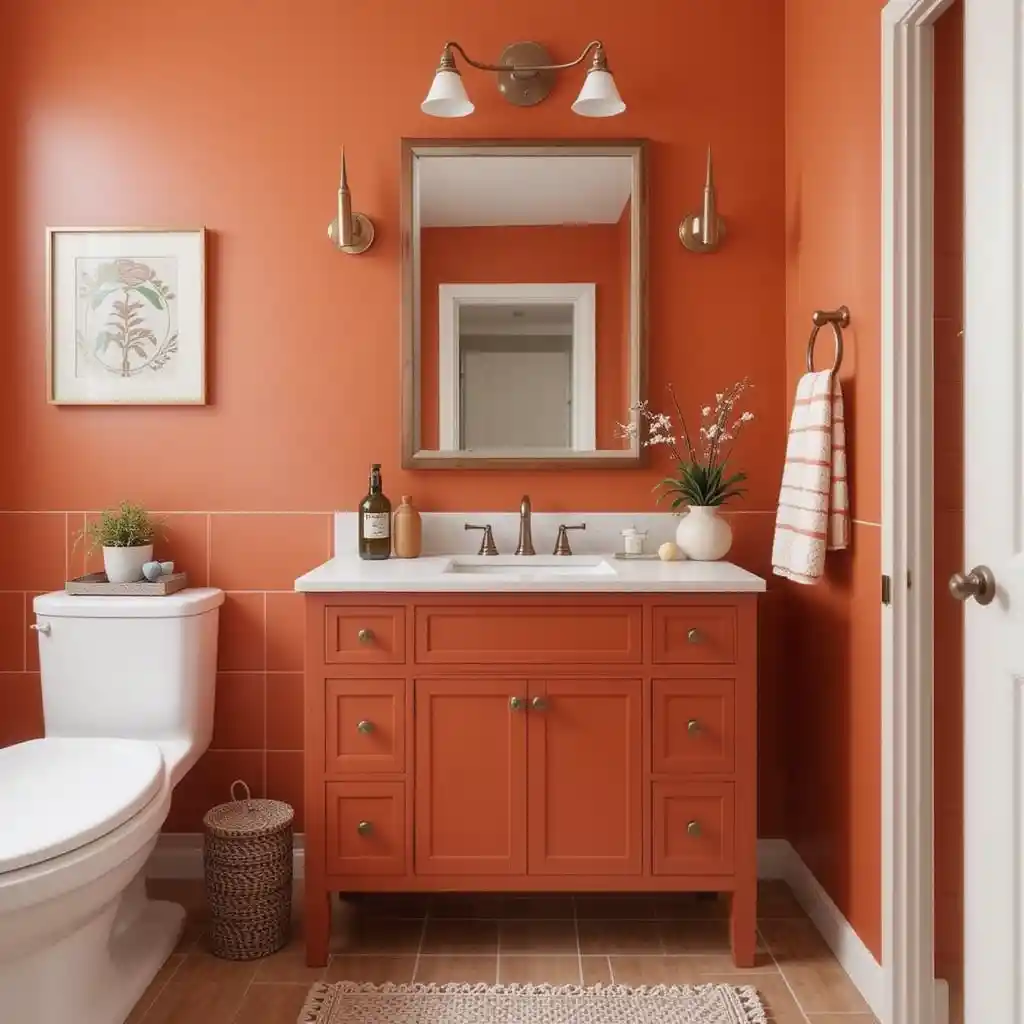 Paint one wall in a rich burnt orange tone to create a dramatic, cozy effect without overpowering the space. It pairs beautifully with neutral tiles and white fixtures. Orange Bathroom Décor Ideas