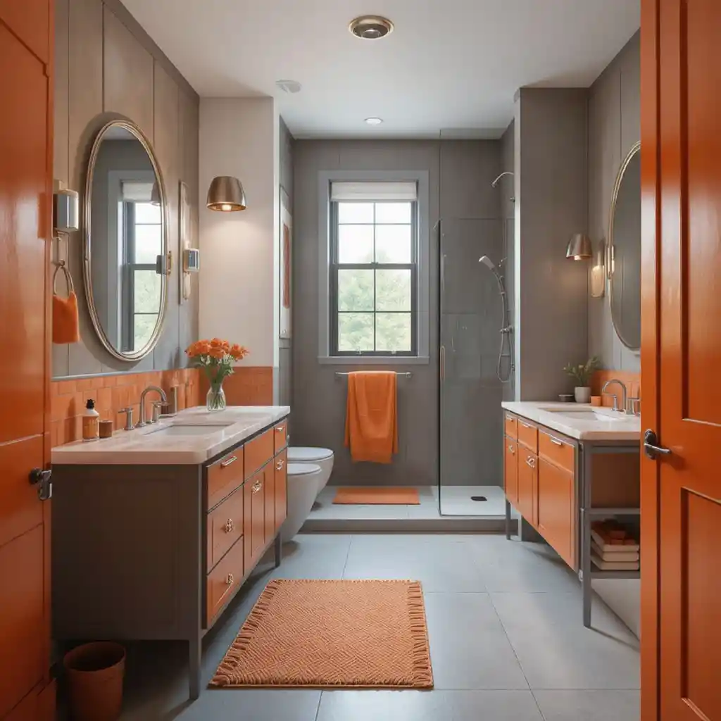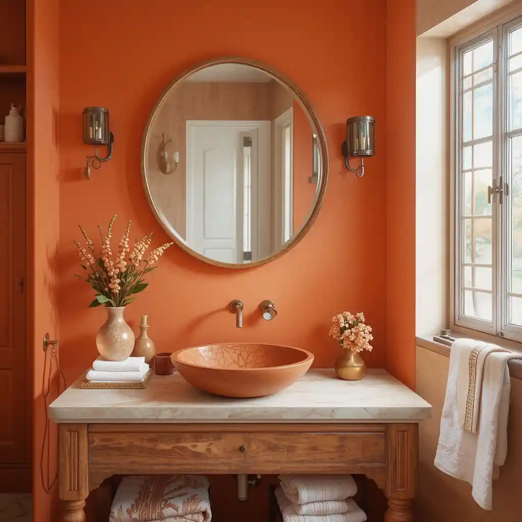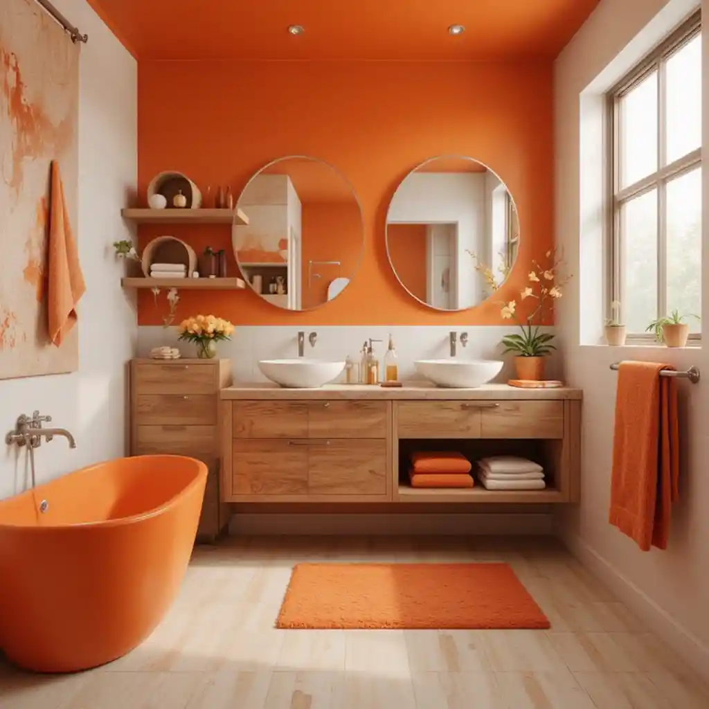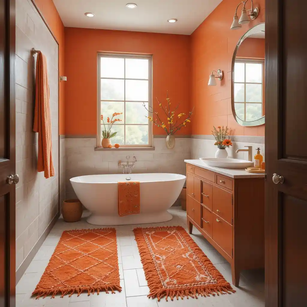 Use natural wood finishes for vanities or shelves alongside orange elements. The combo of organic texture and warm color creates a cozy, rustic atmosphere.