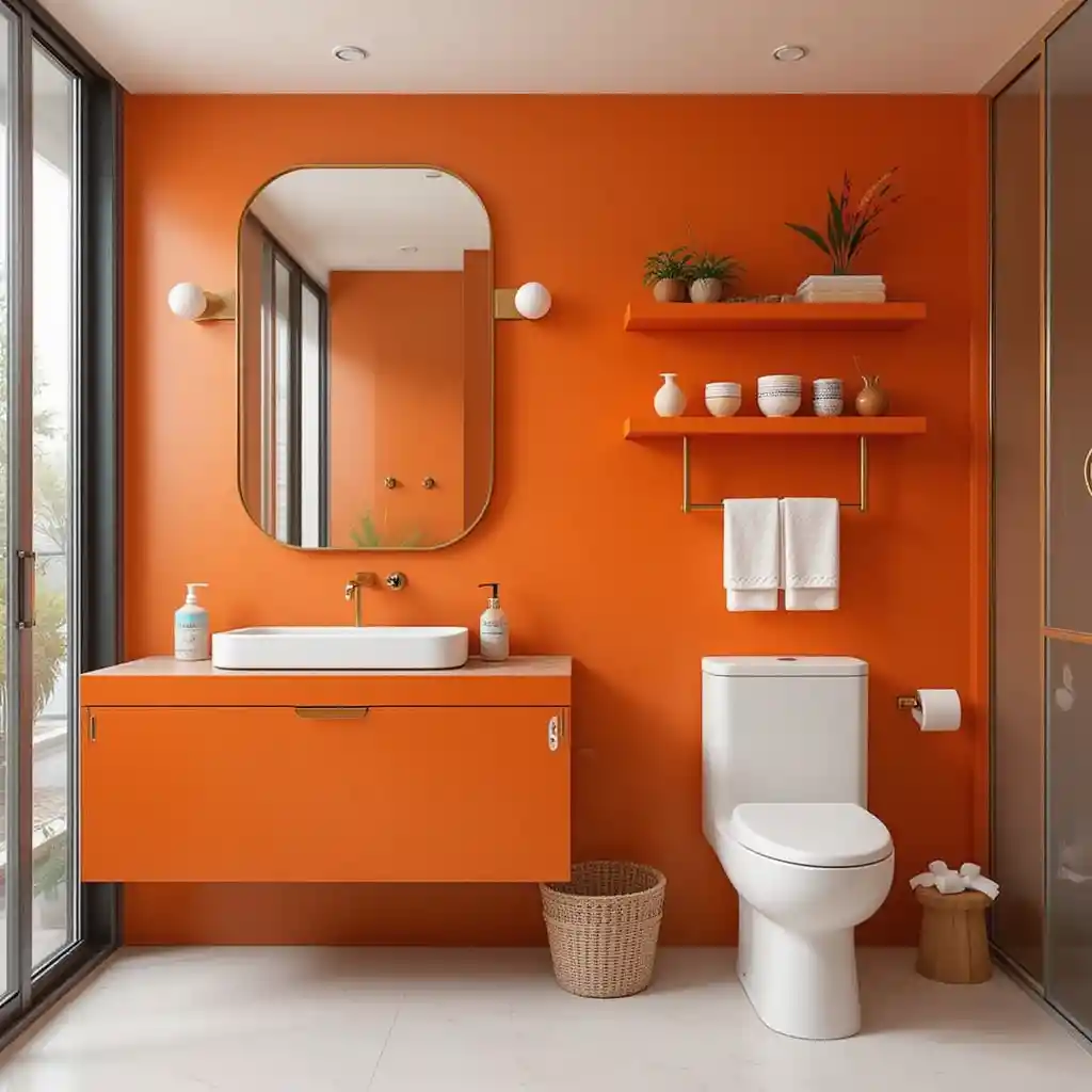 Install orange-painted or lacquered floating shelves to hold toiletries or dĂ©cor. They’re both functional and visually exciting.