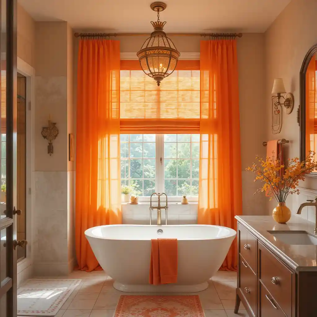 Use sheer orange curtains or Roman shades to let in soft, filtered light. They create a warm glow and blend beautifully with natural light.