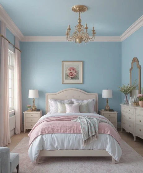 Paint your ceiling sky blue to mimic the open sky. This unexpected pastel touch makes your space feel bigger and more peaceful Pastel Bedroom.