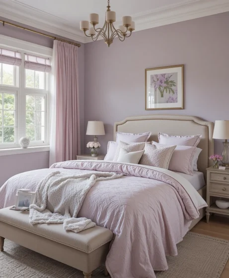 Combine cream and lavender fabrics in your bedding and curtains to create a layered, inviting look. The colors blend effortlessly for an understated touch of luxury Pastel Bedroom.