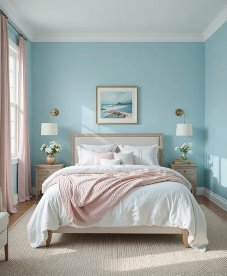 A pastel blue bedroom evokes peace and clarity. Use it on walls or bed linens to create a serene coastal-inspired space that feels light and airy.