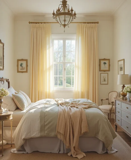 Light yellow curtains let sunlight filter in gently, making your bedroom glow with positivity. Pair them with white walls for a clean and bright look Pastel Bedroom.