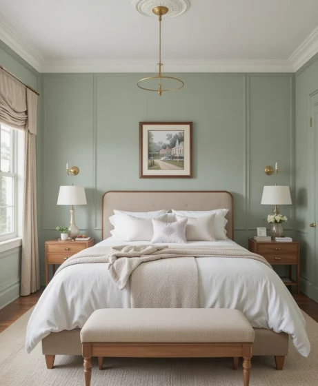 A sage green bedroom feels grounded and refreshing. It works beautifully with wooden furniture, linen fabrics, and white or beige accessories.