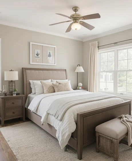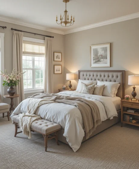 Guest rooms styled with Accessible Beige Sherwin Williams feel warm and welcoming. The neutral tone makes it easy to add different decor styles while ensuring comfort for visitors.