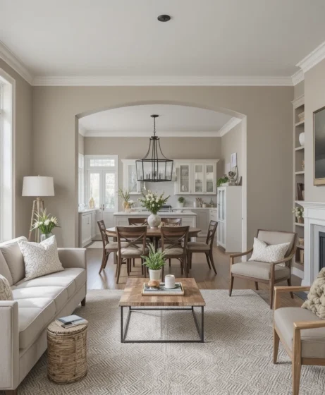 In open layouts, Accessible Beige Sherwin Williams helps connect different areas smoothly. Its neutral tone creates a consistent look across living, dining, and kitchen spaces, making the home feel more cohesive.