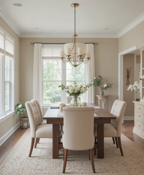 Dining rooms painted in Accessible Beige Sherwin Williams feel warm and inviting. The color pairs beautifully with wooden tables, soft lighting, and simple decor, creating a comfortable space for gatherings.