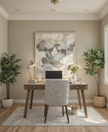 A home office with Accessible Beige Sherwin Williams walls creates a focused and calm environment. The soft tone reduces visual distractions while still feeling comfortable for long working hours.