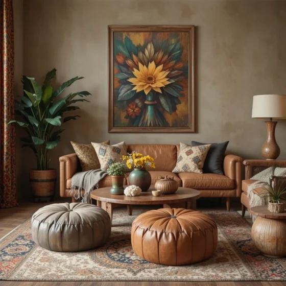 Leather or fabric poufs offer extra seating while enhancing the relaxed vibe. They work well in both small and large spaces. Afrobohemian Living Room