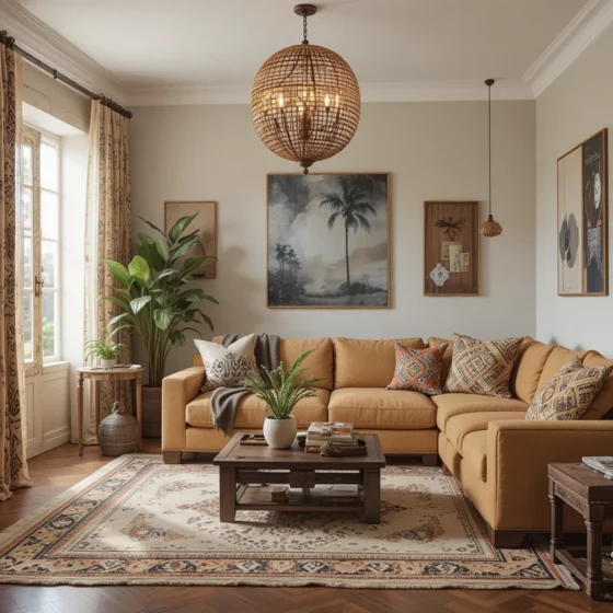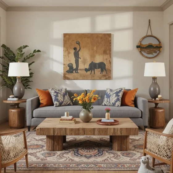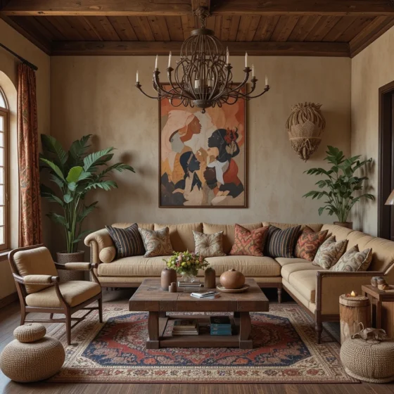 Use warm neutral colors like beige, clay, and soft brown as your foundation. Add tribal-print cushions or throws to bring African influence while keeping the space calm and balanced. Afrobohemian Living Room