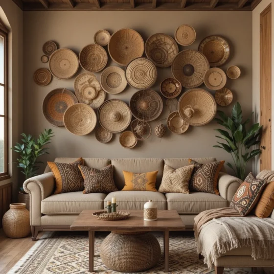 Decorate your wall with handwoven African baskets in different sizes. This creates a natural art feature that adds texture and cultural depth without overwhelming the room.