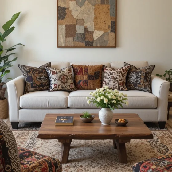 Mud cloth pillows introduce traditional patterns with symbolic meaning. They add contrast and cultural richness to neutral sofas and chairs. Afrobohemian Living Room
