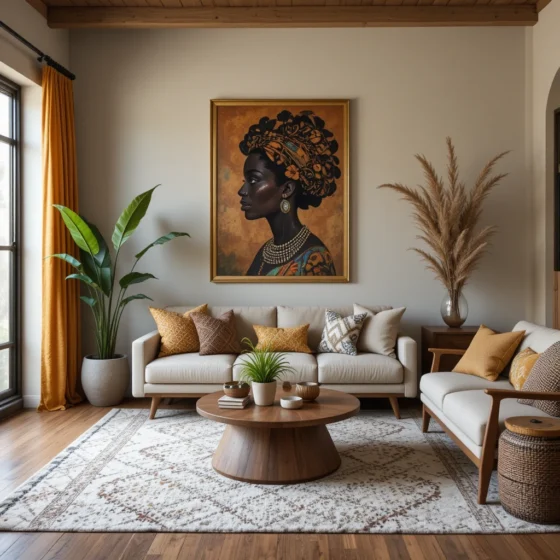 Display bold artwork featuring African portraits or abstract designs. Large-scale art creates a strong focal point and visual impact. Afrobohemian Living Room