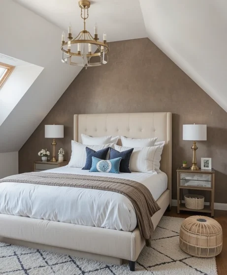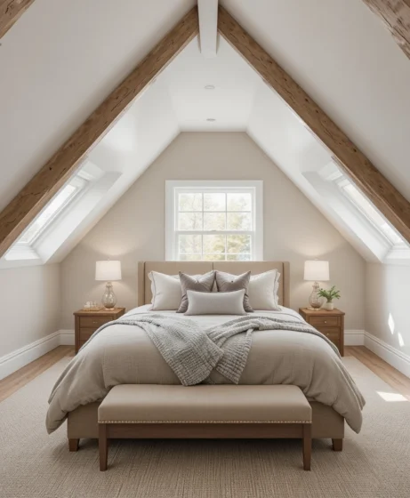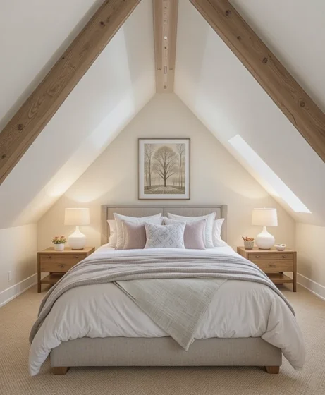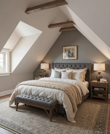 Beige, taupe, and warm gray tones create a soothing palette. These colors blend well with natural light and wood details. They help make the attic bedroom feel restful Attic Bedroom Ideas.
