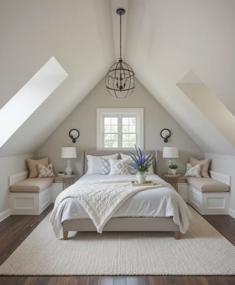 Window seats or built-in benches add charm and function. They use low-height areas creatively. This feature makes the attic bedroom feel inviting Attic Bedroom Ideas.