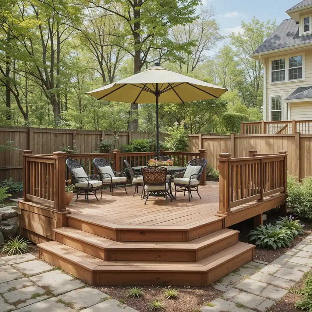 Split your backyard into levels with a multi-tiered deck, offering separate zones for dining, lounging, or grilling—ideal for larger or sloped yards.