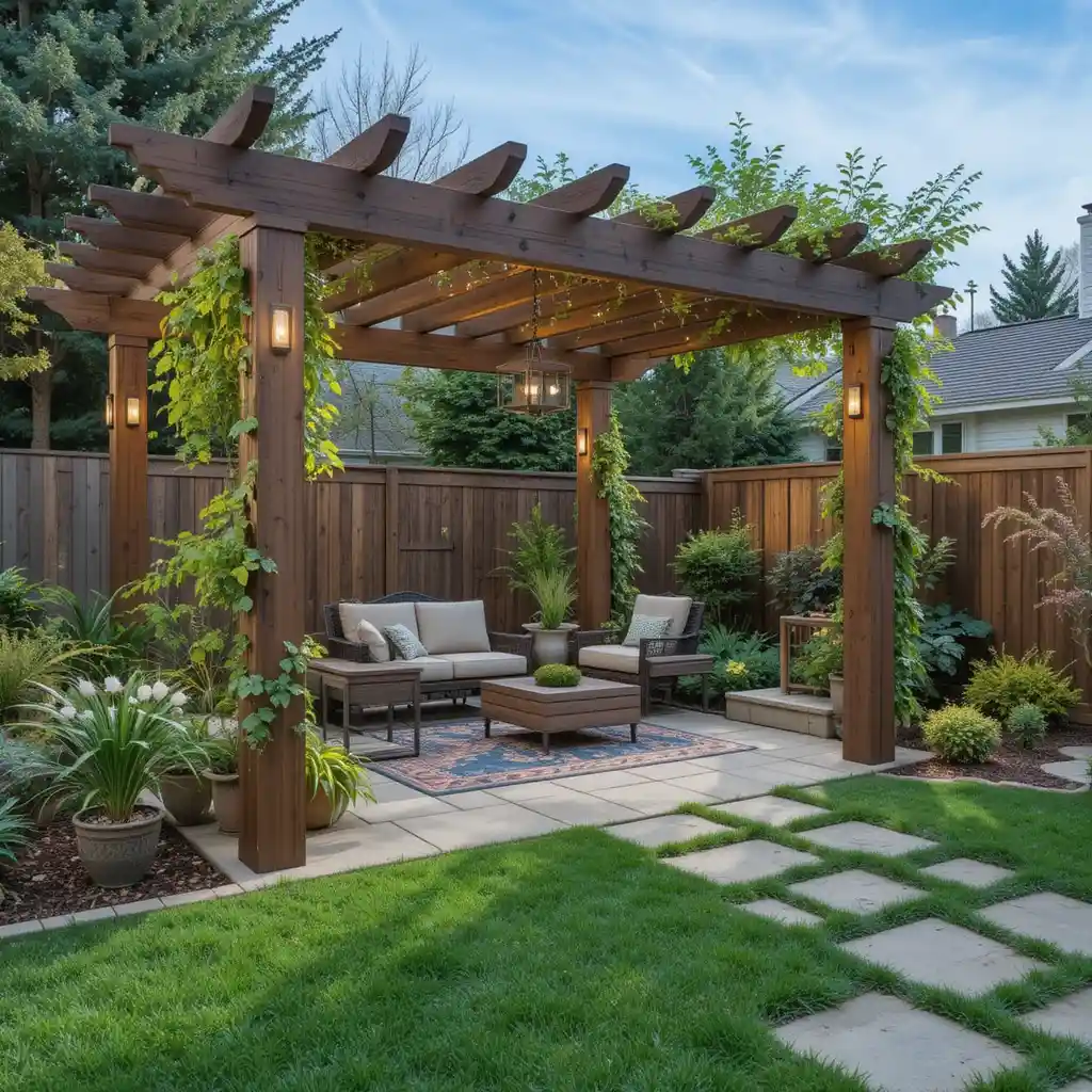 A pergola defines a space while offering partial shade and vertical dimension. Add climbing plants or string lights for even more charm.