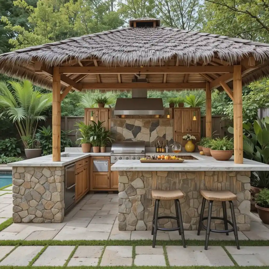 Use bamboo, palm leaves, and a thatched roof to bring vacation vibes to your backyard kitchen, perfect for summer cookouts and fruity drinks.