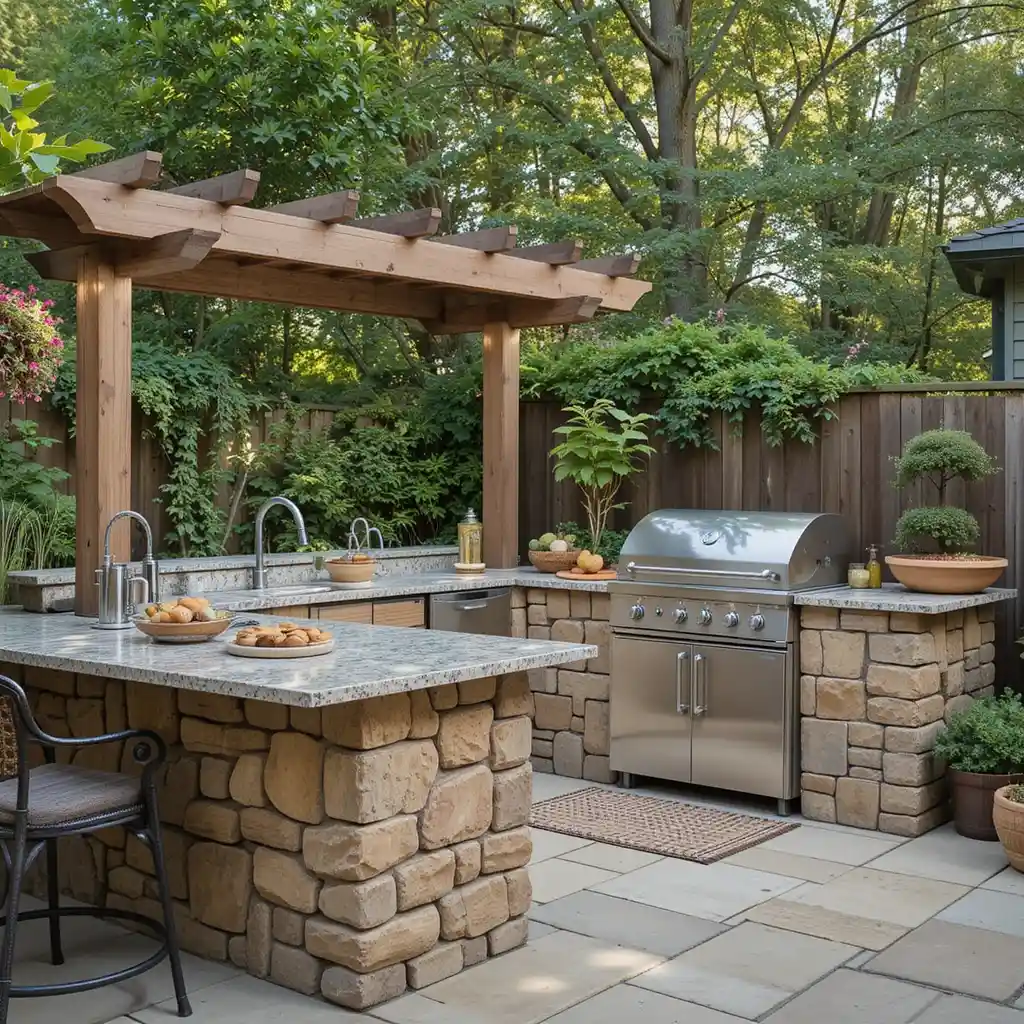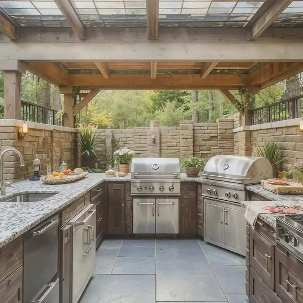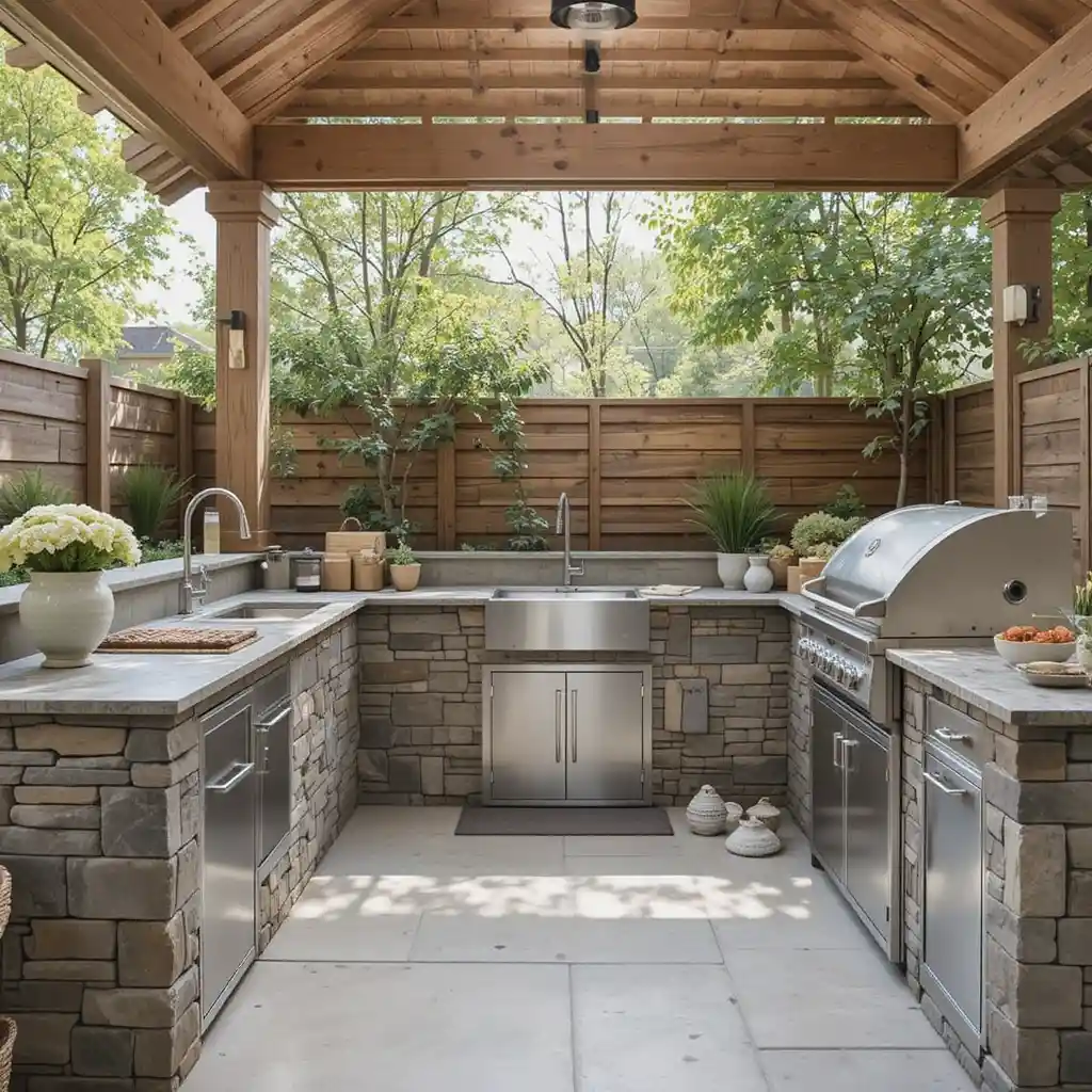 Natural stone or brick adds warmth and durability, giving your outdoor kitchen a timeless, earthy look that blends perfectly with gardens or patios. Outdoor Kitchen Ideas