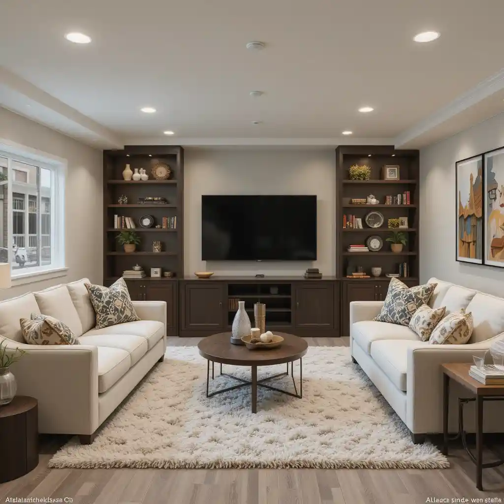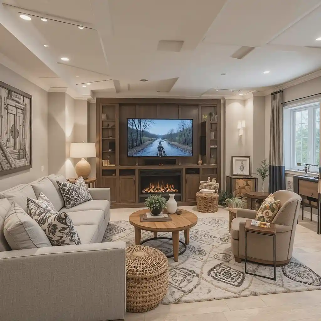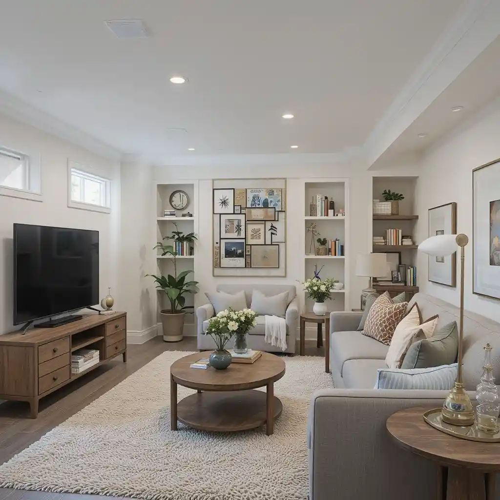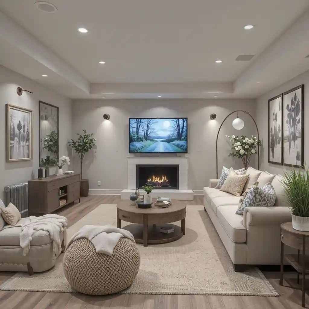 Soft grays, creams, and beiges give the room a bright, open, and relaxing vibe, especially in a space that may have limited natural light. Basement Family Room Ideas
