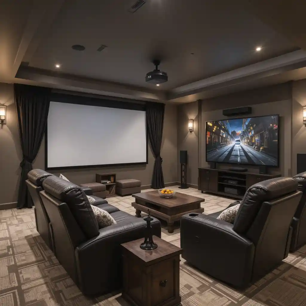 Install a projector or large TV with surround sound for the ultimate basement movie experience, complete with blackout curtains and reclining seats.