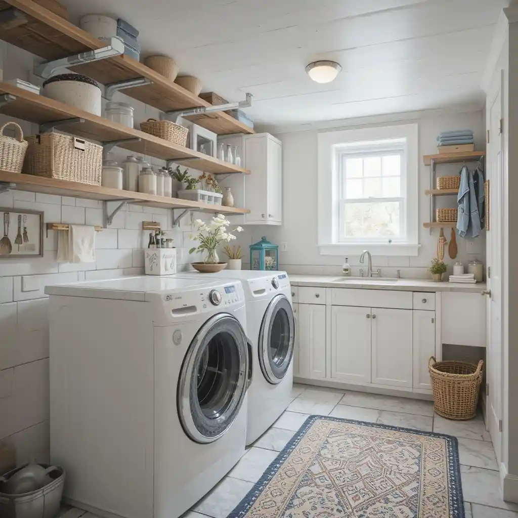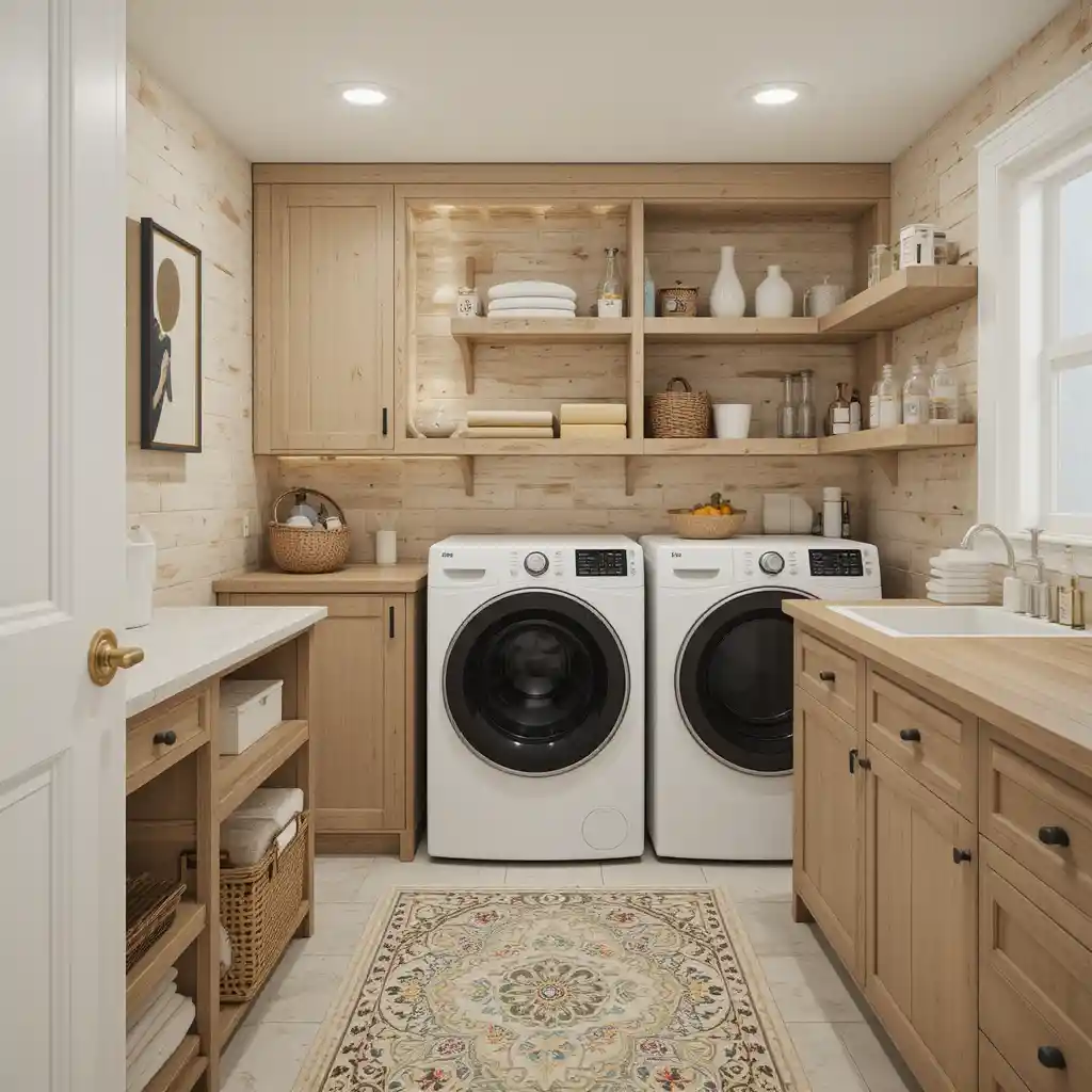 Use open wood or metal shelves above the machines to store baskets, towels, or dryer sheets for easy access and aesthetic appeal.