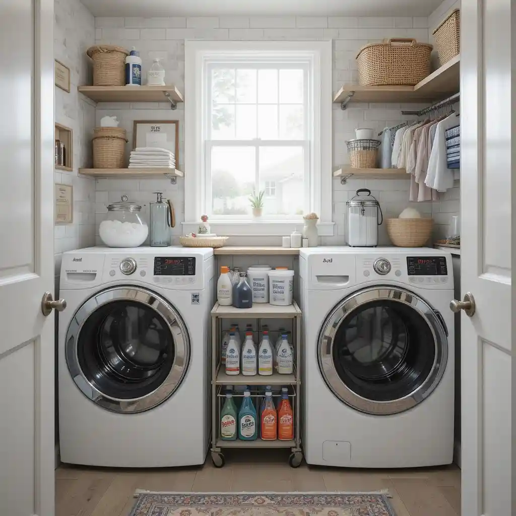 A slim rolling cart fits perfectly between machines and offers mobile storage for supplies like softener, detergent, and dryer sheets.