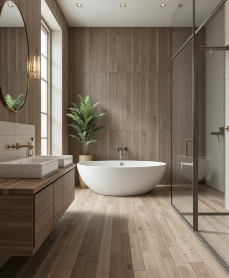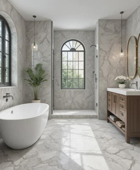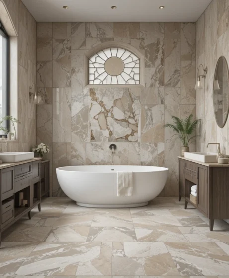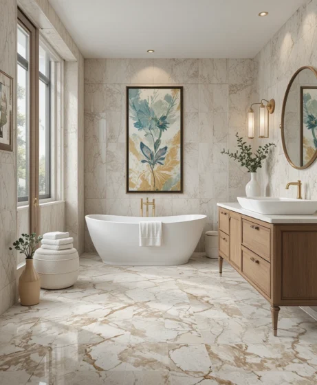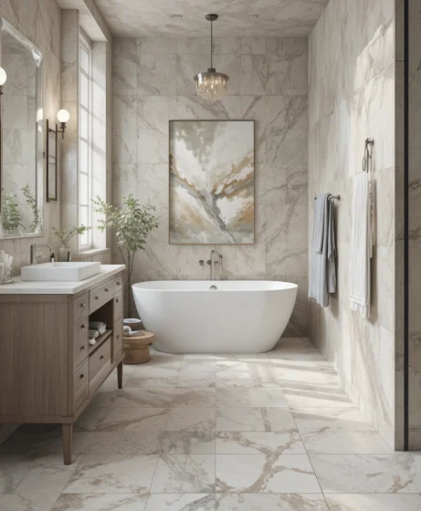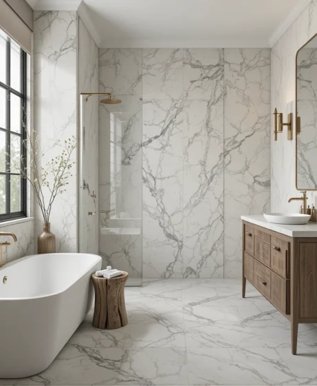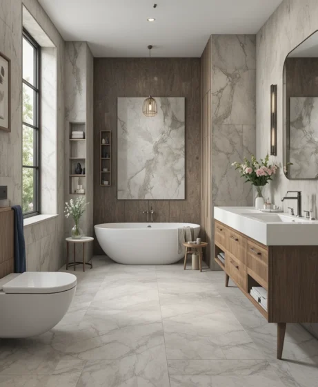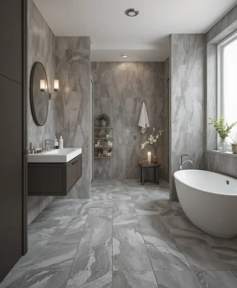 Porcelain tiles that mimic natural stone give bathrooms a spa-like feel. They’re durable, water-resistant, and perfect for everyday use.