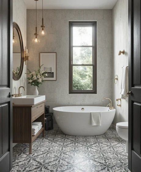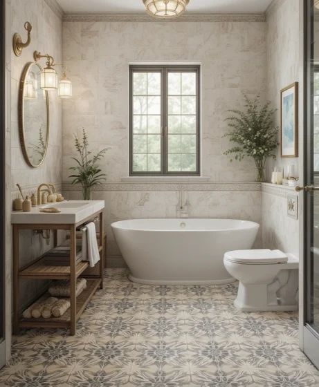 Geometric Moroccan patterns add personality. Keep walls simple so the floor remains the hero Bathroom Floor Tile.