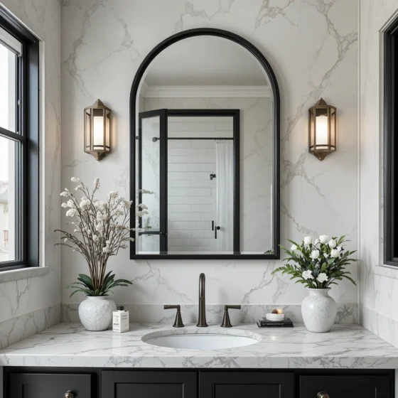 Go big with an oversized mirror that visually doubles your space. This design enhances brightness, creates depth, and gives your bathroom a luxurious, spa-like atmosphere.