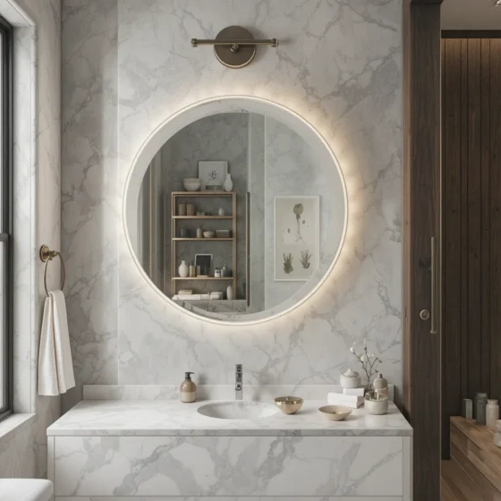 Combine round design with soft lighting using a backlit round mirror. It offers a soothing glow perfect for unwinding while adding a high-end spa-like touch to your Bathroom Mirror