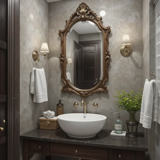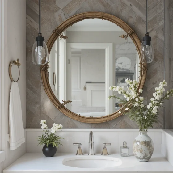 Add luxury and elegance with an antique gold-framed mirror. The metallic finish pairs beautifully with marble countertops and warm lighting for a chic, glamorous vibe.