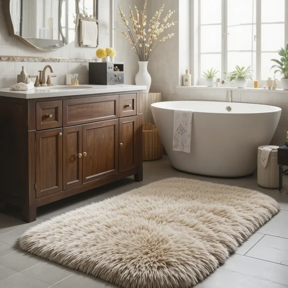 Add a touch of luxury and glamour with faux fur rugs. Their silky texture instantly elevates your bathroom’s appeal. Place them near a vanity or dressing area for that plush, Hollywood-inspired feel.
