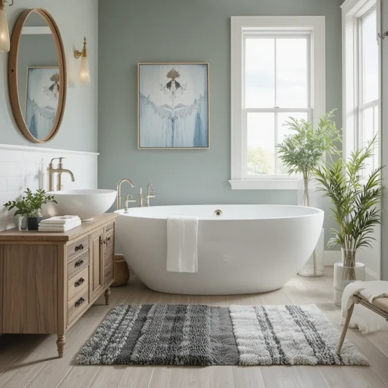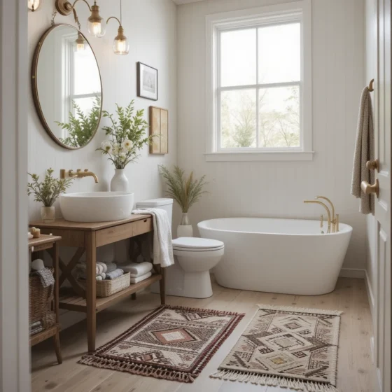 Introduce Turkish or Persian-inspired rugs for a sophisticated, artistic vibe. These rugs feature intricate patterns and rich colors that elevate bathroom elegance while still being cozy underfoot.