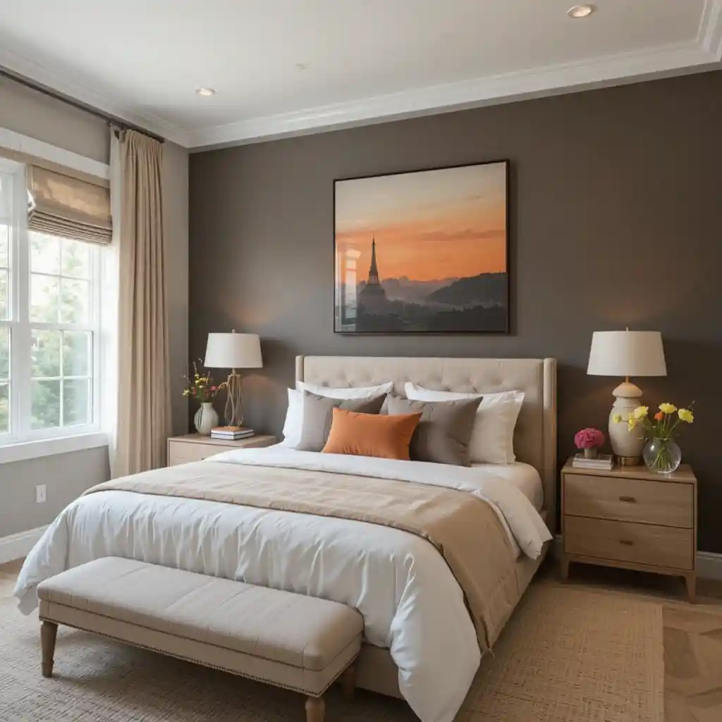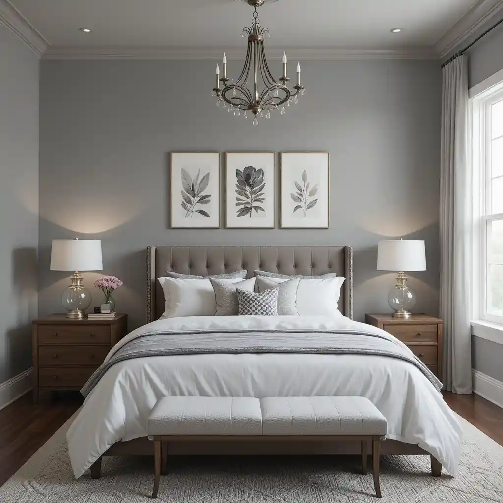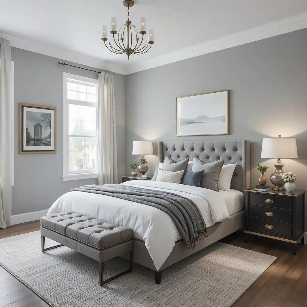 A soft gray palette brings timeless sophistication. It creates a calming vibe and pairs well with both bold and neutral accents. Bedroom Color Ideas