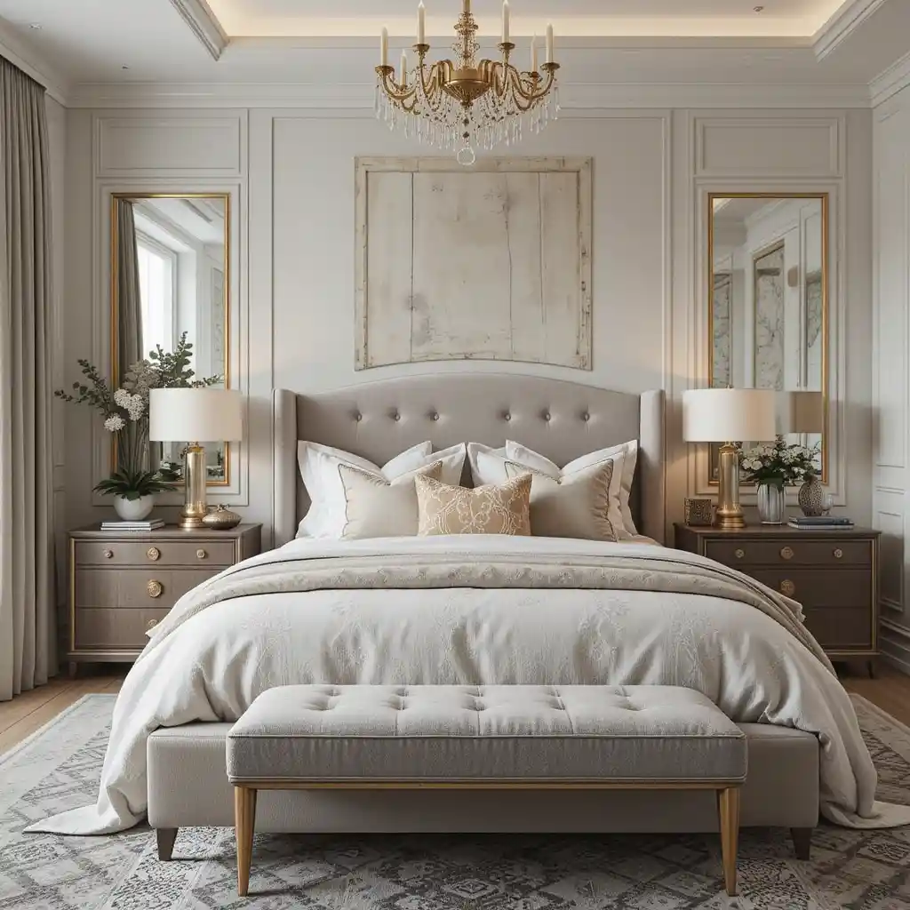 Oversized mirrors not only enlarge the room visually but also add sparkle. Choose frames with metallic or carved details. Bedroom Master Design Ideas