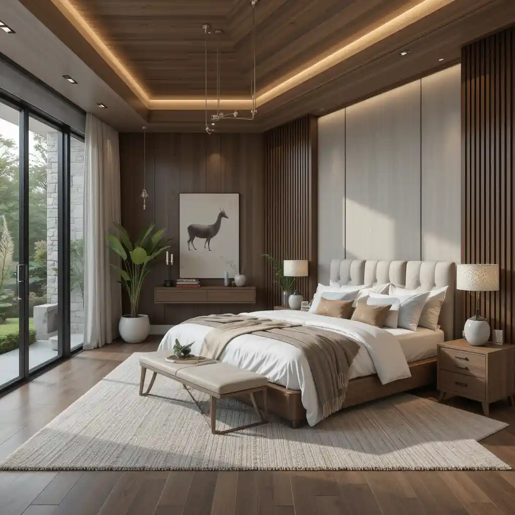 Wood, stone, and plants balance modern luxury with warmth. Natural details make the bedroom feel grounded and inviting. Bedroom Master Design Ideas