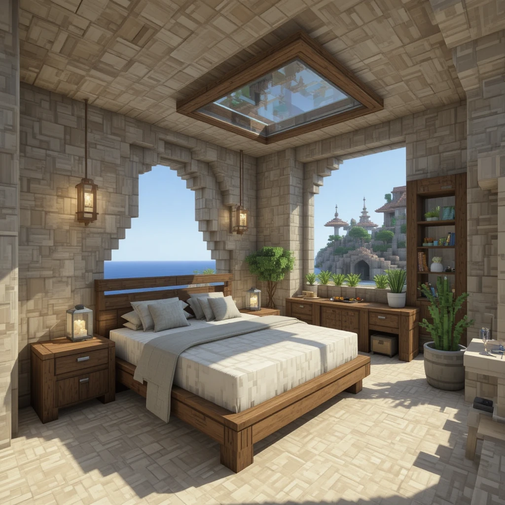 Use sandstone, oak wood, and glass to create a breezy beach bedroom. Decorate with potted cacti, bamboo, and sea lanterns. This simple yet stylish design brings tropical relaxation to your survival world.