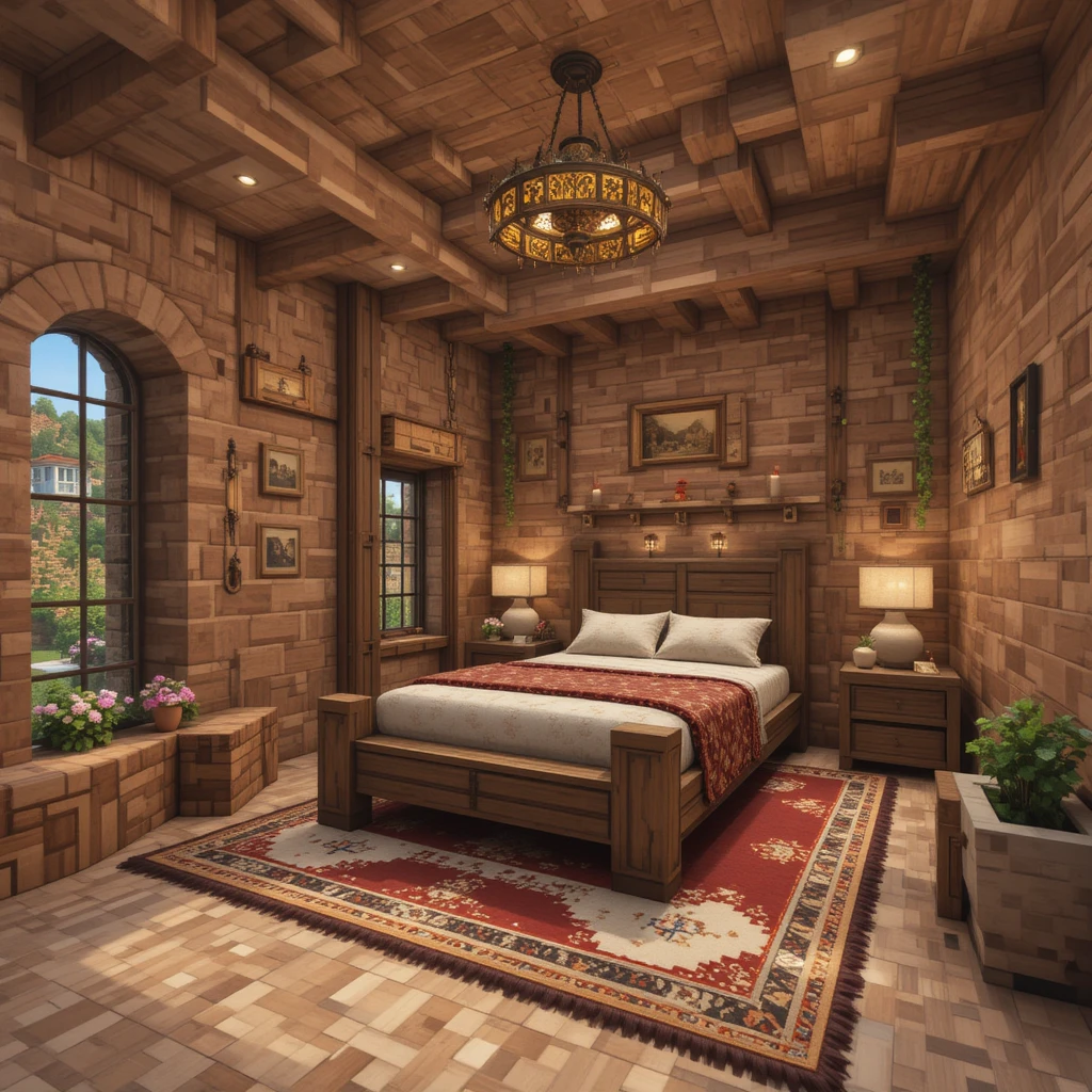 Use oak wood, spruce logs, and wool to create a warm and rustic feel. Add lanterns for lighting and a carpet near your bed to make the space feel lived-in. This classic wooden theme is perfect for early-game survival bases.