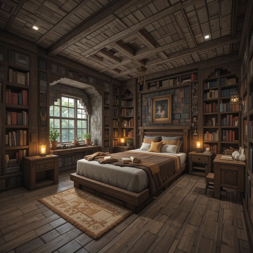 Combine function and style by designing a bedroom inside a library. Surround your bed with bookshelves, candles, and lecterns. It’s perfect for players who love enchanting or reading while relaxing in their Minecraft world. Bedroom Minecraft Ideas