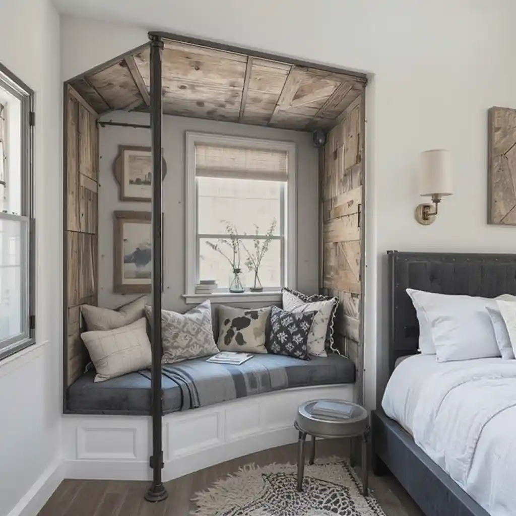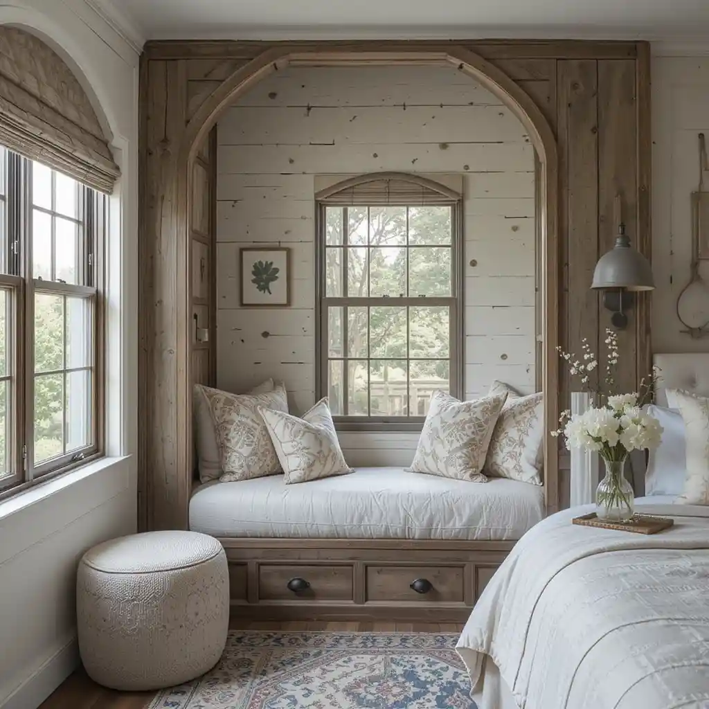 Incorporate shiplap walls, distressed wood, and soft fabrics to create a farmhouse-inspired nook. Ideal for warm, homey bedroom styles.