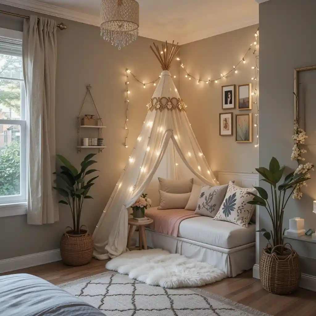Create a magical space with a teepee tent, soft mats, and string lights in one corner. Perfect for kids’ bedrooms, offering a cozy spot for play or rest.