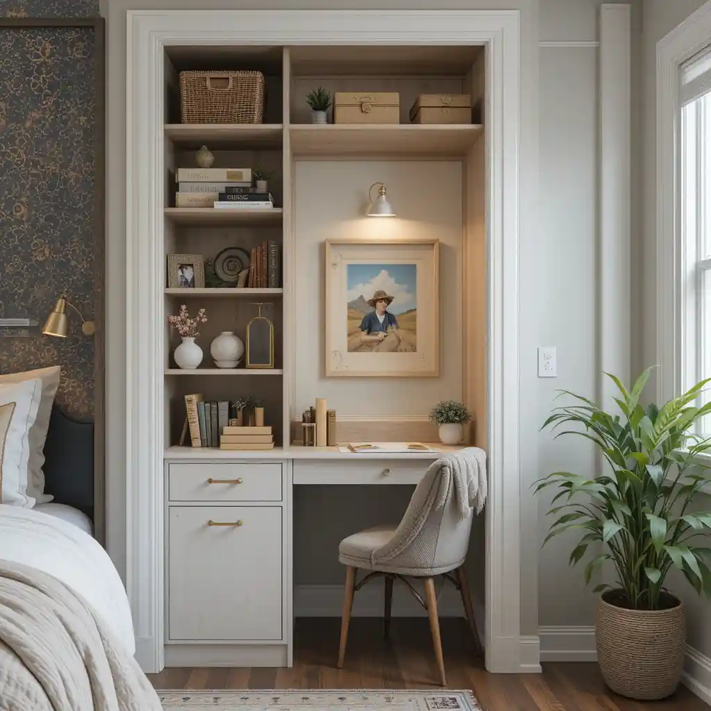 Transform a small closet into a hidden office nook. Add a mini desk, sconce lighting, and organizers for a seamless and functional workstation.