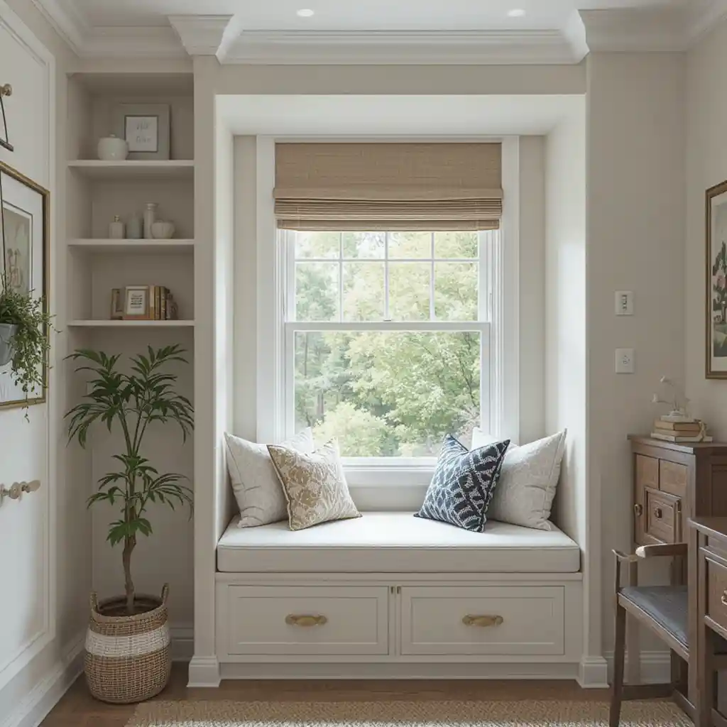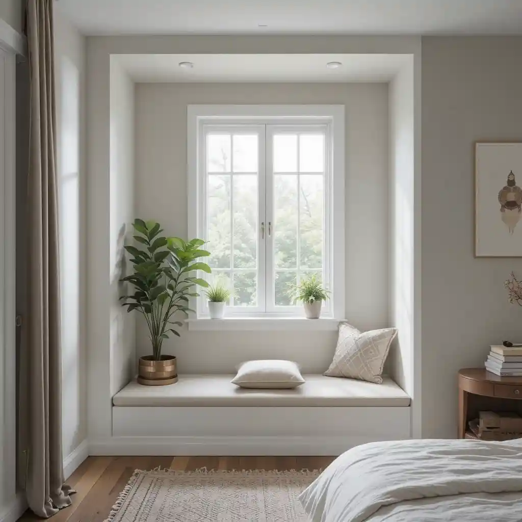 A window nook with a cushioned bench adds charm and doubles as hidden storage. It’s perfect for soaking in natural light while keeping clutter out of sight. Bedroom Nook Ideas