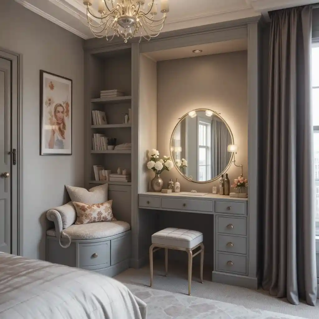 Use a spare corner for a makeup vanity with a mirror, stool, and chic lighting. Add drawers or trays for organized storage and a touch of glam.