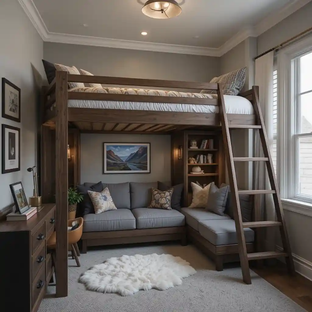 Build an elevated loft bed with a nook underneath. This lower area can be used for a desk, sofa, or gaming setup, especially in teen or college bedrooms.