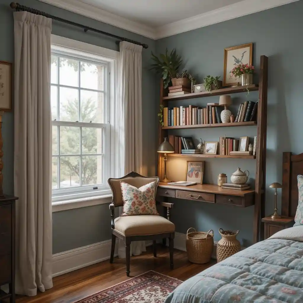 Use a ladder shelf, antique chair, and small lamp to craft a vintage-inspired book nook. Opt for warm tones, old books, and nostalgic decor to complete the look.