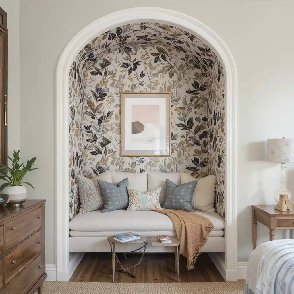 Frame your nook with an arched design and add a bold wallpaper pattern inside it. It becomes an architectural and visual centerpiece without taking up space.